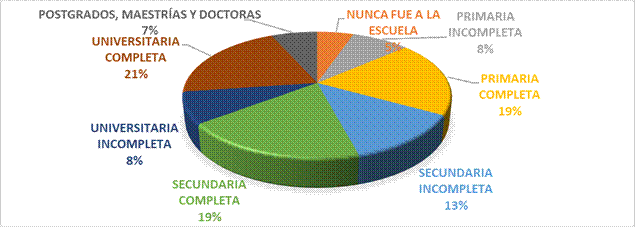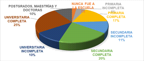 En cuanto al nivel educativo logrado por los adultos bajo investigación se tiene que el 21% logró terminar una educación universitaria, una educación secundaria (19%), mientras que un 5% no fue a la escuela. Ver fig. 5
