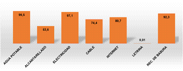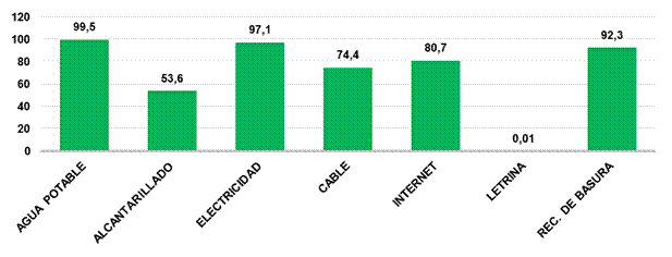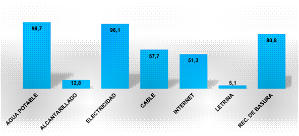 Una alta proporción de las viviendas del área bajo estudio disponen de los servicios básicos de dotación de agua potable, electricidad y recolección de la basura (99.5%, 97.1% y 92.3%, en ese mismo orden). (Ver fig. 8)