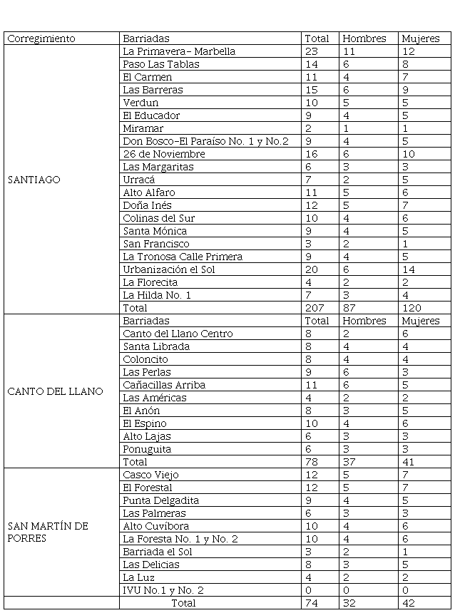 Es importante señalar que, como solo se entrevistaba a un adulto mayor por hogar visitado, se trató de lograr entrevistas balanceadas por sexo, de manera que la investigación reflejara la situación del adulto mayor tal como es y evitar un sesgo debido al sexo de la persona. Una vez llevado a cabo el trabajo de campo se logró la siguiente composición de la muestra para las encuestas realmente aplicadas por corregimiento, barriada y sexo, lo cual no dista mucho de la composición originalmente planteada: