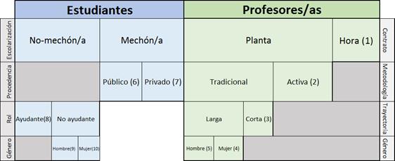 Para profesores/as: tipo de contrato (profesor/a hora y planta), metodología utilizada en clases (activa y tradicional), trayectoria de docencia (trayectoria larga y corta) y género (hombre y mujer).