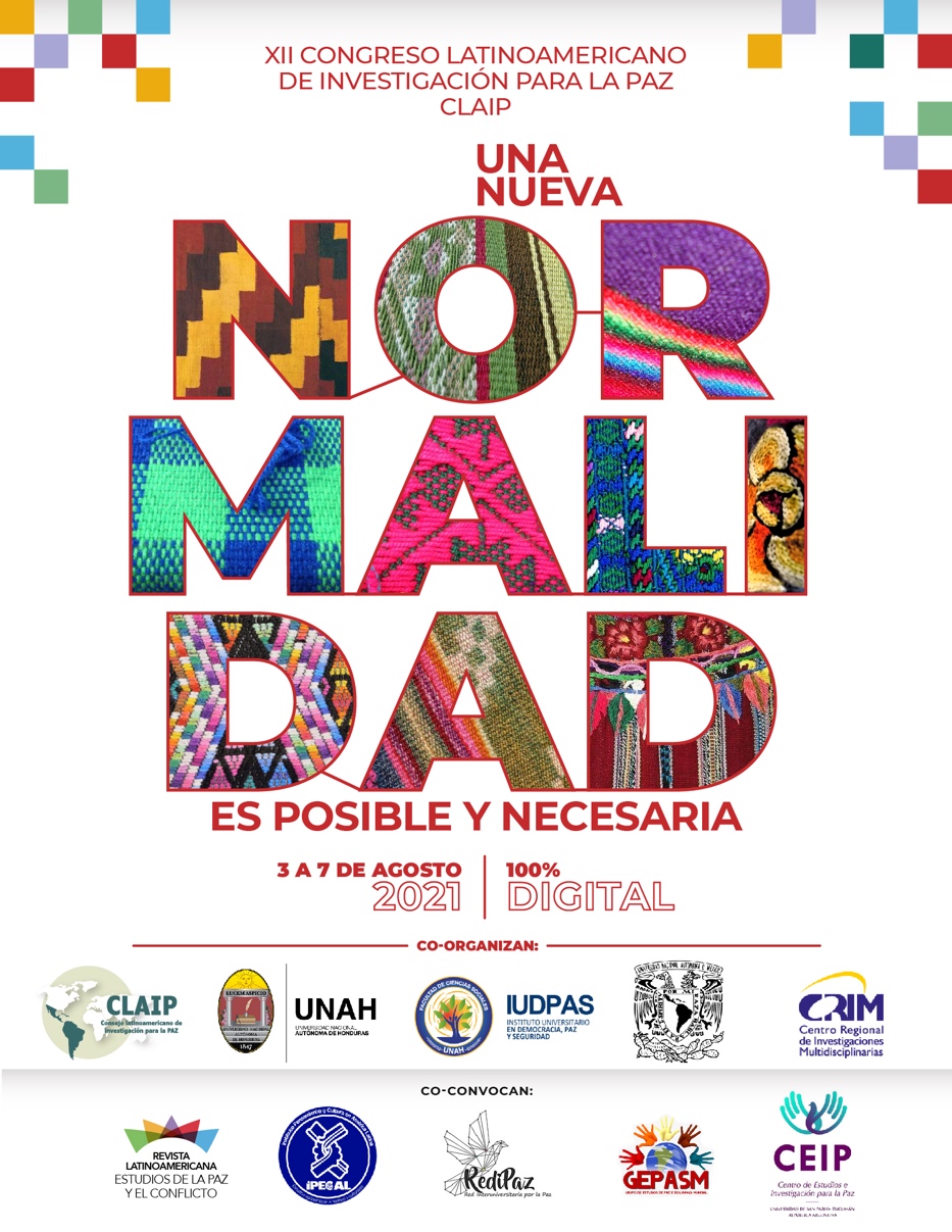 Durante los pasados días 3, 4, 5, 6 y 7 de agosto de 2021 se celebró el XII Congreso Latinoamericano de Investigación para la Paz del Consejo Latinoamericano de Investigación para la Paz (CLAIP), por vez primera, en modalidad 100% Online y libre de costo para todo tipo de participantes. El evento fue co-organizado por la Universidad Nacional Autónoma de Honduras (UNAH) a través del Área de Paz del Instituto Universitario en Democracia, Paz y Seguridad (IUDPAS) y por el Centro Regional de Investigaciones Multidisciplinarias (CRIM) de la Universidad Nacional Autónoma de México (UNAM). El desarrollo del congreso contó como entidades co-convocantes con la Revista Latinoamericana Estudios de la Paz y el Conflicto (ReLaPaC), con el Instituto Pensamiento y Cultura en América Latina (IPECAL), con la Red Interuniversitaria por la Paz de Colombia (REDIPAZ), con el Grupo de Estudos de Paz e Segurança Mundial (GEPASM), y con el Centro de Estudios e Investigación para la paz (CEIP); y, asimismo, con el auspicio de la International Peace Research Association (IPRA) y de 68 instituciones, centros de estudio e investigación, Grupos de Trabajo CLACSO, redes académicas, movimientos y organizaciones sociales firmantes del Manifiesto por Una Nueva Normalidad (CLAIP, 2020), investigadores e investigadoras, artistas y activistas por la paz de América Latina.