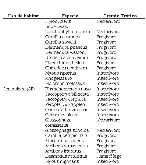 La mayoría de las especies pocos comunes pertenecen a la familia de los Phyllostomidae. Especies como Ectophylla alba, Thyroptera tricolor (Thyropteridae) prefieren bosques húmedos y sin una alta intervención. Otras Especies como Lophostoma silviculum, Macrophyllum, Trachops cirrhosus son especies bioindicadores de calidad de hábitat ya que muchos de ellos fueron encontrados en hábitat con nivel de intervención bajo y son propias de bosque maduro (Medina-Fitoria, 2014), estas especies son indicadores de la integridad del ecosistema. De tal manera, también, hubo especies que sobresalieron en casi todos los hábitats, en el cuadro 1 se describen estas especies que fueron mucho más comunes y fueron capturados en distintos tipos de condiciones (Flores-Saldaña, 2008). En estas especies se tienen a Artibeus jamaicensis, Artibeus lituratus, Glossophaga soricina que por lo general no aparecen. Carollia castanea y Carollia sowelli que también se presentaron en muchos de los hábitats muestreados, son también especies generalistas que tienen amplia distribución en el país y aprovechan distintos tipos de hábitat. Además, son importantes en la regeneración de los bosques ya que son murciélagos que se especializan y explotan el máximo las fuentes de alimentos que encuentran, en la obtención de frutas y flores (néctar y polen) para sus hábitos alimenticios y ayudan a la dispersión de semillas de muchas plantas (R. A. Medellín et al., 2000)diverse, and easy to sample, especially in the Neotropical rainforest, they fulfill sev- eral of the requirements of indicator species as identified in the literature. For 10 months we sampled bat communities in the Selva Lacandona in Chiapas, Mexico, at 15 sites representing five habitats. We also mea- sured 10 variables representing vegetation structure and diversity at each site. With fuzzy-set techniques we produced a gradient classification of disturbance for the 15 sites based on the vegetation data. We explored the relationship between vegetation conditions, described as the membership degrees in the construct “fuzzy forest set” (the complementary fuzzy set of “disturbance”.