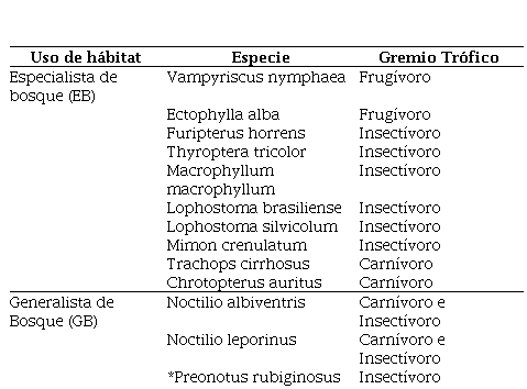 Entre las especies especialistas de bosques identificadas, destacan los Phyllostominae- insectívoros: Lophostoma brasiliense, Lophostoma silvicolum, Mimon crenulatum, los que son muy sensibles a altos niveles de perturbación. También se identificaron dos especies, Furipterus horrens (Furipteridae), Thyroptera tricolor (Thyropteridae) que son endémicas en América y Ppropios de Centroamérica y Suramérica. F. horrens es típico del interior del bosque, conocido únicamente en el Sureste de Nicaragua (Medina-Fitoria, 2014). Esta especie insectívora, se capturó únicamente dentro del Bosque Húmedo (BH), aparentemente la especie se encuentra asociada a sistemas ambientales saludables y equilibrados que le proveen los requerimientos alimenticios como son insectos pequeños (moscas, zancudos y polillas) forrajeando lentamente de uno a cinco metros del suelo, sugiriendo el vuelo de las mariposas Morpho. (Roughgarden, J., & Diamond, J. 1986).