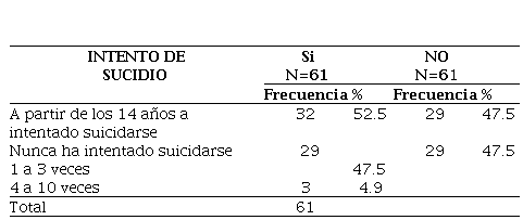 Se determinó que el 52.5% ha intentado suicidarse desde los catorce años, de ellas el 47.5% lo ha intentado de una a tres veces y el 4.9% lo intentó de cuatro a diez veces.