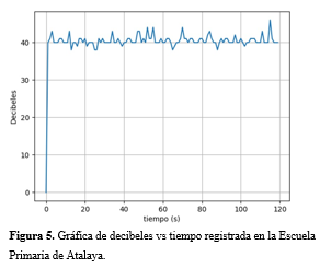 Se realizaron captura de datos en los diferentes centros educativos en horarios matutinos y vespertinos, generando gráficas de decibeles vs tiempo como se muestra en la figura 5.
