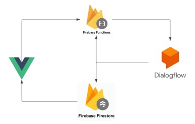 En la figura 1 se muestra un esquema de nuestra arquitectura. La cual fue desarrollada utilizando tecnologías Web como VueJS para la integración del frontend que visualiza el usuario. Firebase Functions como serverless backend encargado de ser el puente de comunicación entre los mensajes enviados por el usuario y el sistema de PLN, el cual es gestionado por