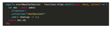 En la figura 3 podemos ver las dos acciones que son ejecutadas a través de una llamada a nuestra Cloud function inicial, la respuesta al llamado de esta función será el id único de documento generado automáticamente por Cloud Firestore para identificar la conversación.