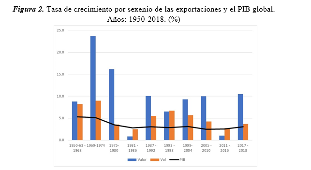 Tabla 1. Tasa de crecimiento (%) por sexenio de las exportaciones y el PIB global. Período:1950-2018