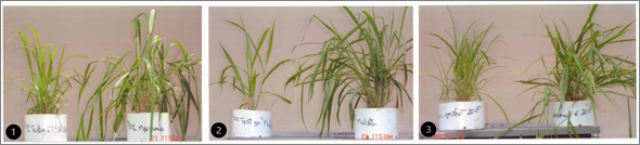 Brachiaria brizantha CIAT 6780 (Marandú) (de izq. a derecha, fotografía 1); Brachiaria híbrido CIAT 36061 (Mulato) (fotografía 2); Brachiaria decumbens CIAT 6780 (fotografía 3). Nótese el poco crecimiento a los 30 días de rebrote de la planta sembrada sin abono orgánico (izquierda), y la planta sembrada con abono orgánico (derecha) en cada fotografía.