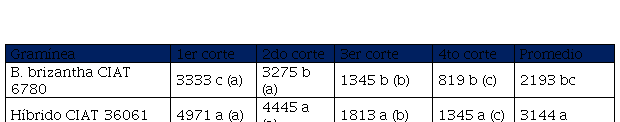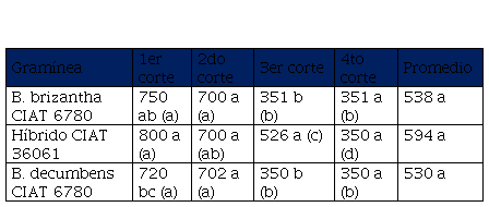 abc/ Dentro de una misma línea vertical (con paréntesis) u horizontal, los valores con una o más letras en común no difieren entre si al 5% de probabilidad según la prueba de medias de Duncan.Los valores del testigo absoluto se pueden observar en la tabla 3. Los mayores rendimientos de materia seca se obtuvieron en el primer y segundo corte y producciones entre 700 y 800 kg/ha/corte en las tres Brachiarias. La pastura que presentó el mayor rendimiento promedio de materia seca fue B. híbrido CIAT 36061 con 594 kg/ha/corte, sin embargo, la misma no difirió (p>0.05) de las otras forrajeras. Estas producciones de biomasa se consideran muy bajas si se comparan con reportes de estas Brachiarias en suelos de baja fertilidad (Pinzón y Montenegro, 2000).