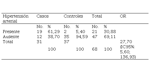 Se elaboraron tablas para cada variable de interés: hipertensión arterial, diabetes, tabaquismo, cardiopatías, antecedentes de enfermedad crónica renal y cáncer, para cada tabla se presentó el número y porcentaje de casos y controles, así como el OR (odds ratio) y su intervalo de confianza al 95%.