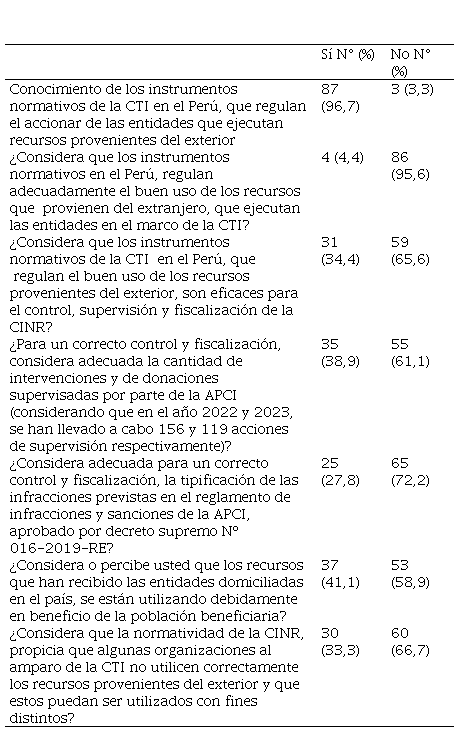 Se determinó que 59 (65,6%) de los encuestados señaló que los instrumentos normativos de la CTI en el Perú que regulan el buen uso de los recursos provenientes del exterior no son eficaces para el control, supervisión y fiscalización de la CINR mientras que 31 (34,4%), contestó que los instrumentos normativos de CTI en el Perú que regulan el buen uso de los recursos provenientes del exterior sí son eficaces para el control, fiscalización y supervisión de la CINR.