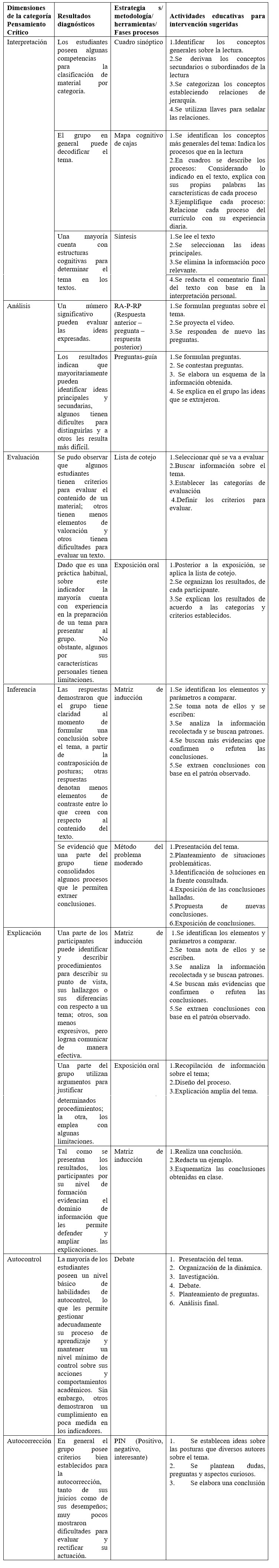 Se identificaron amplias oportunidades de mejora en el ámbito cognitivo y metodológico. En este sentido, el diseño de una estrategia de intervención pedagógica, como la propuesta en este estudio, puede constituirse en un medio eficaz para consolidar las competencias existentes y desarrollar nuevas habilidades, promoviendo la autonomía intelectual, la reflexión sistemática y la toma de decisiones informadas.