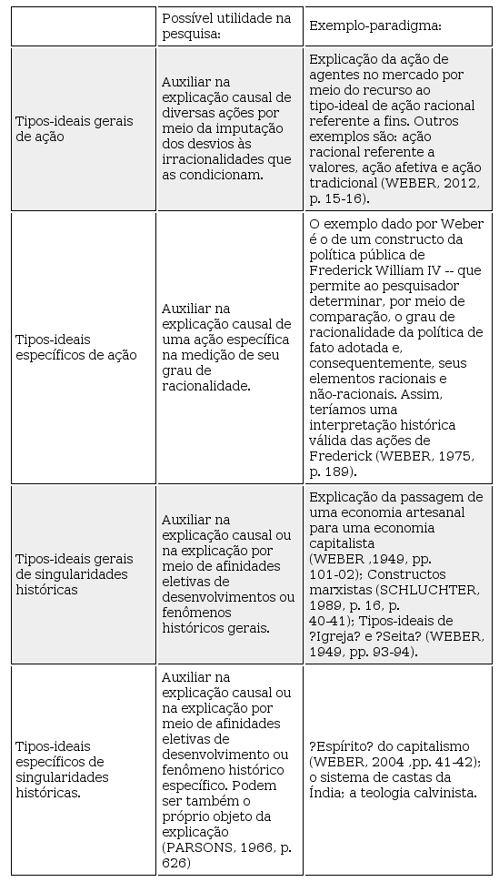 A exposição dos dois últimos pontos mencionados no parágrafo anterior baseia-se em uma classificação que sugiro para se entender melhor o tipo-ideal e seus possíveis usos. A exposição visará evidenciar que o tipo-ideal não é uma ferramenta funcionalmente unitária. Isto é, ele se desdobra, a meu ver, em quatro ?espécies? ou configurações de tipo-ideal, de acordo com sua função metodológica. Numa primeira divisão, o tipo-ideal pode ser utilizado tanto na análise da ação, quanto na análise de singularidades históricas (tipos-ideais de ação x tipos-ideais de singularidade histórica). Numa segunda divisão, esses tipos se desdobram em mais gerais e mais específicos. Esta segunda divisão está baseada em uma diferenciação entre causalidade histórica -- que visa identificar as circunstâncias únicas que tiveram como efeito um dado acontecimento histórico -- e causalidade sociológica -- que visa identificar relações regulares (prováveis, mas não necessárias) entre fenômenos (ARON, 2000, p. 458 e p. 467) (WEBER, 2012, pp. 12-13). Os tipos são gerais ou específicos, portanto, quanto ao alcance de sua aplicação. Temos, assim, quatro categorias ou espécies de tipos-ideais, que serão melhor abordadas nos tópicos seguintes. Essas categorias de tipos-ideais, em casos limite, podem se confundir. A sua separação esquemática foi feita apenas para fins de clareza expositiva.