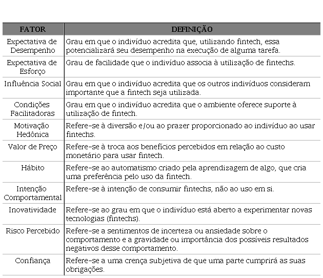 No modelo UTAU2, a expectativa de desempenho, expectativa de esforço, influência social, condições facilitadoras, motivações hedônicas, valor de preço e hábito, afetam a intenção de uso das fintechs, com as variáveis idade, sexo e experiência sendo moderadoras dessas relações. No entanto, optou-se por não utilizar as relações de moderação e acrescentar outras variáveis propostas por Slade et al. (2015): Inovatividade, Risco Percebido e Confiança. A Tabela 1 a seguir apresenta os fatores e suas definições.