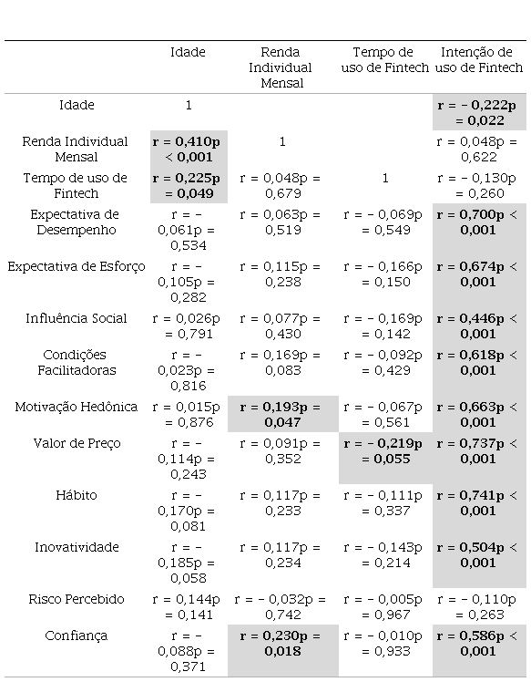 Também foram relevantes as correlações moderadas entre a intenção de uso de fintech e: expectativa de esforço (r = 0,67; p < 0,001); motivação hedônica (r = 0,66; p < 0,001); e condições facilitadoras (r = 0,62; p < 0,001). Deste modo, quanto maior a facilidade que o indivíduo possui em usar fintech, maior será a intenção de usá-la; quanto maior o prazer e diversão associadas ao uso de fintech, maior será a intenção de usá-la; e, quanto mais condições facilitadoras do uso de fintech o indivíduo tem, maior será a intenção de usá-la. A seguir, a tabela 2 demonstra os resultados encontrados no teste correlação de Pearson, cujos resultados significativos estão destacados.