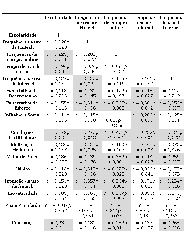 Com relação à frequência de uso de internet por dia, observou-se correlações baixas com: expectativa de esforço (r = 0,26; p = 0,007), condições facilitadoras (r = 0,22; p = 0,023), valor de preço (r = 0,26; p = 0,007), intenção de uso de fintech (r = 0,23; p = 0,016), confiança (r = 0,26; p = 0,006). Quanto mais o indivíduo utiliza internet maior será a facilidade em usar fintech, maior o custo-benefício em usá-la e também maior será a intenção de uso. A tabela 3 apresenta todas as correlações encontradas destacadas.