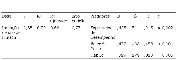 Foi realizada uma regressão múltipla padrão considerando o fator intenção de uso de fintech como variável critério [F(10,95) = 24,19; p < 0,001] e os fatores como variáveis independentes. De acordo com o quadro 1, as variáveis independentes são: Expectativa de Desempenho, Expectativa de Esforço, Influência Social, Condições Facilitadoras, Motivação Hedônica, Valor de Preço, Hábito, Inovatividade, Risco Percebido e confiança. Os fatores expectativa de esforço, condições facilitadoras e risco percebido apresentaram coeficientes não-padronizados negativos, indicando que existe relação inversa entre estes fatores a intenção de usar fintech. Os preditores apresentaram 69% de variância explicada para a intenção de uso de fintech. Os preditores significativos foram expectativa de desempenho, valor de preço e hábito, sendo o valor de preço o fator que mais contribuiu para explicar a intenção de usar fintech. Os demais fatores não colaboraram para explicar a intenção de uso de fintech nessa análise de regressão.