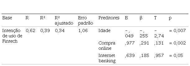 Foi realizada também uma regressão múltipla padrão considerando o fator intenção de uso de fintech como variável critério [F(8,97) = 7,66; p < 0,001], e as variáveis sociodemográficas e comportamentais (sexo, idade, renda individual mensal, escolaridade, frequência de uso de fintech , frequência de compra online, tempo de uso de internet e frequência de uso de internet) como variáveis independentes. A variável idade apresentou coeficiente não-padronizado negativo, indicando que existe relação inversa entre idade e a intenção de usar fintech. Os preditores apresentaram 34% de variância explicada para a intenção de uso de fintech. Os preditores significativos foram idade, compra online e usa internet banking, sendo a compra online a variável que mais contribuiu para explicar a intenção de usar fintech. Os demais fatores não colaboraram para explicar a intenção de uso de fintech nessa análise de regressão.