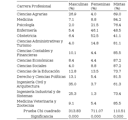 Y, en cuanto a la comparación de las carreras profesionales según ocupaciones masculinas y femeninas, se hallaron los siguientes resultados: los del sexo masculino eligieron con mayor frecuencia la carrera de Ingeniería Civil y Arquitectura (p ? 0,000), el sexo femenino fue para la carrera de Obstetricia (p ? 0,000); y la ocupación mixta fueron las carreras de Ciencias Económicas y Ciencias Sociales (p ? 0,000).