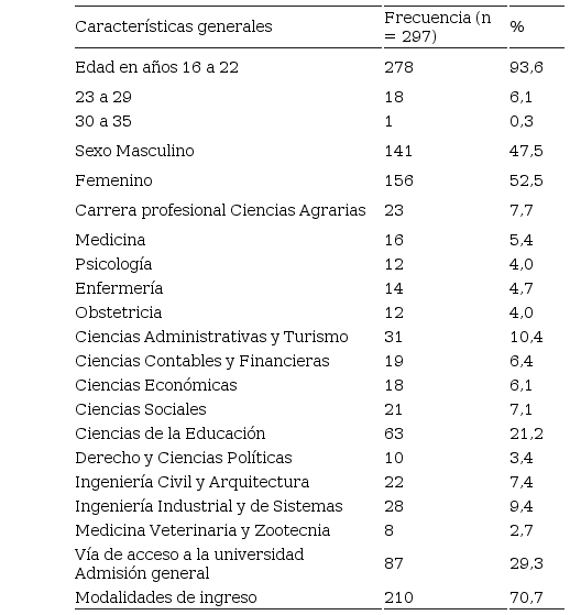 En relación con las características generales, se encontró que 93,6 % (278 estudiantes) presentaron edades entre 16 a 22 años, asimismo, que 52,5 % (156 estudiantes) fueron de sexo femenino, 21,2 % (63 estudiantes) eligieron la carrera de Ciencias de la Educación y 70,7 % (210 estudiantes) fueron seleccionados a través de modalidades de ingreso.