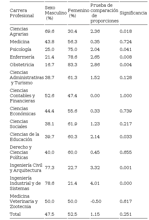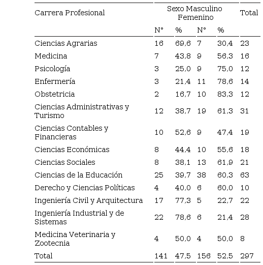 Respecto a las carreras profesionales según sexo, en el masculino fueron más frecuentes las carreras profesionales de Ciencias Agrarias, Ciencias Contables y Financieras, Ingeniería Civil y Arquitectura e Ingeniería Industrial y de Sistemas que en el femenino. En cambio, en este predominaron las carreras de Medicina, Psicología, Enfermería, Obstetricia, Ciencias Administrativas y Turismo, Ciencias Económicas, Ciencias Sociales, Ciencias de la Educación y Derecho y Ciencias Políticas. En la carrera Medicina Veterinaria y Zootecnia fue similar la proporción.