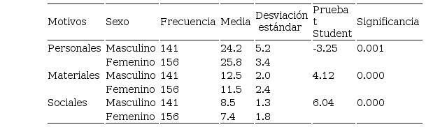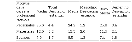 Con respecto a las diferencias de motivos de carrera profesional elegida según sexo, se evidenció que existen diferencias al respecto, ya que los motivos personales están dominadas por el sexo femenino (p ? 0,001), y las de materiales y sociales por el sexo masculino (p ? 0,000).