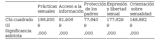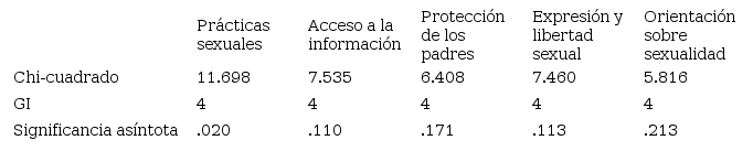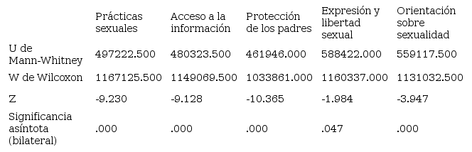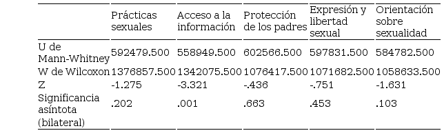 Se realizó una prueba de tipo U de Mann-Whitney para determinar la existencia de diferencias significativas por cada una de las dimensiones del estudio, de acuerdo con su sexo biológico. Al realizarse la prueba, aparecieron diferencias estadísticamente significativas para todas las variables medidas, es decir, el sexo es determinante en la percepción y realización de prácticas sexuales (p = 0.00), el acceso que se tiene a la información (p = 0.00), el tipo de protección que se recibe de los padres (p = 0.00), la expresión y libertad sexual (p = 0.47) y la orientación sobre sexualidad que se recibe (p = 0.00).