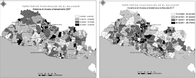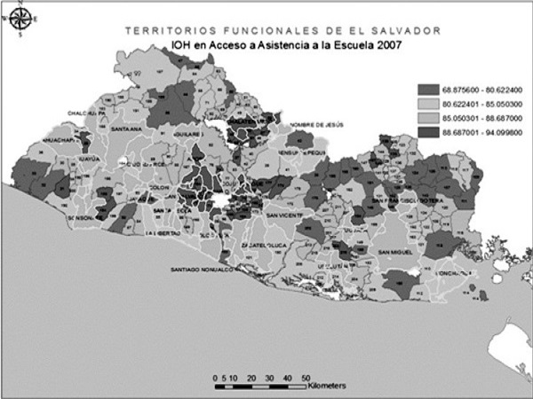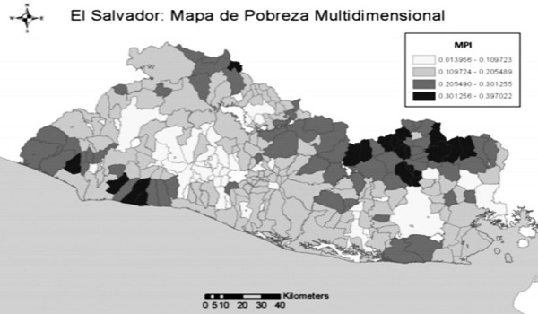 La característica territorial de las desigualdades en el país ha sido explorada en algunas investigaciones previas. Amaya y Cabrera (2013) ofrecen un panorama territorial, a escala de municipios de El Salvador, de las desigualdades internas, a través del cálculo de un índice de pobreza multidimensional (IPM) basado en la metodología de la Oxford Poverty & Human Development Initiative (OPHI), la cual sintetiza en un indicador las características del entorno en que habitan los pobladores de los municipios, tal como el nivel educativo de los jefes de hogar, el grado de asistencia a la escuela de los niños, los niveles de mortalidad infantil, el origen del agua, la modalidad del servicio sanitario, el tipo de alumbrado en el hogar, material del piso, tipo de combustible que utiliza y equipamiento general como automóvil, refrigerador, teléfono u otro.