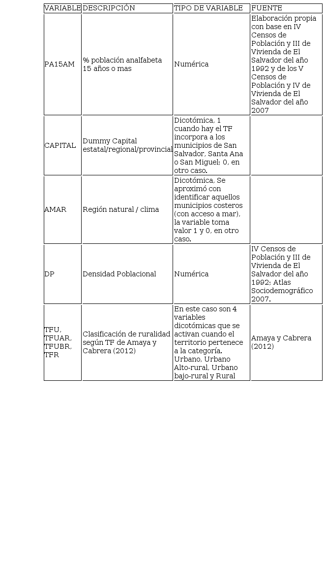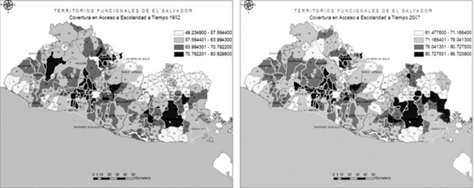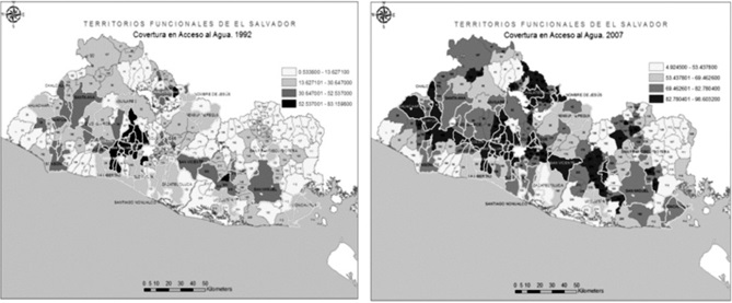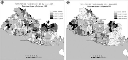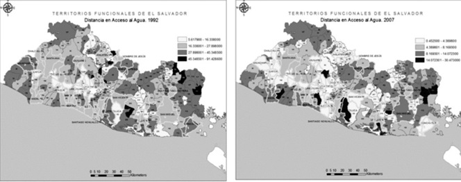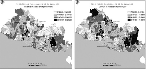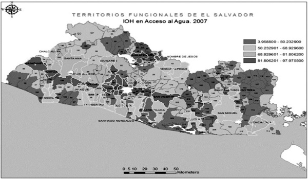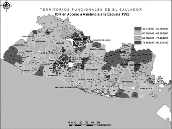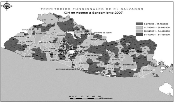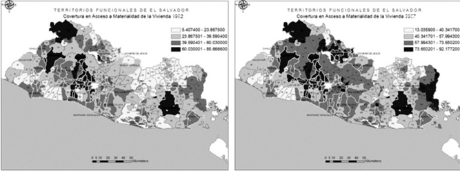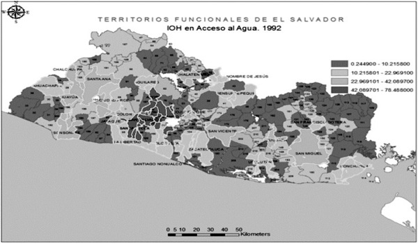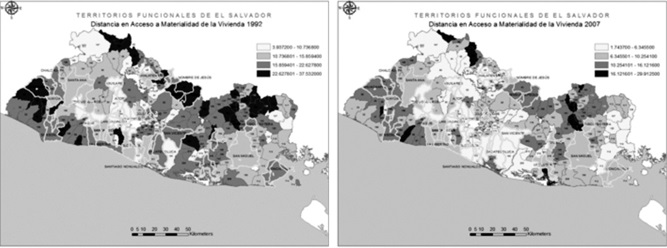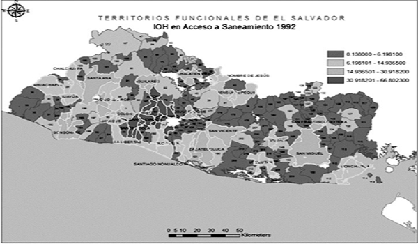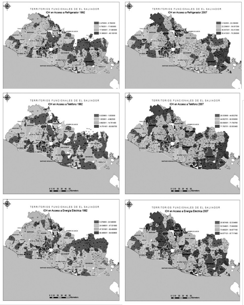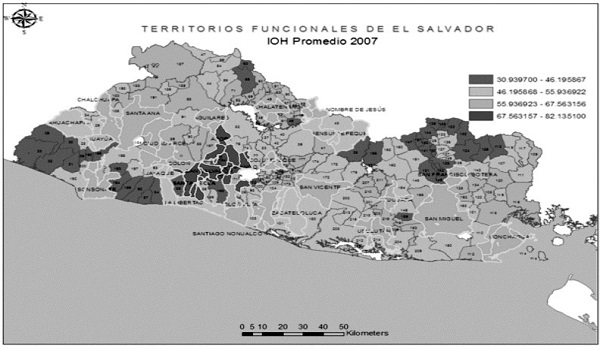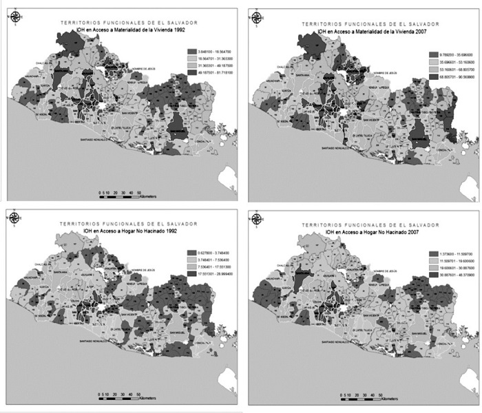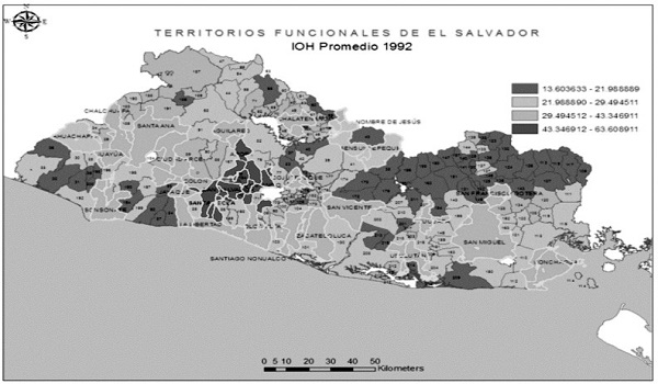 La aplicación para el caso de El Salvador consistió en una estimación territorial del IOH para los dos últimos años en que se realizaron los censos de población y vivienda (1992 y 2007). La desagregación territorial elegida fueron los territorios funcionales estimados por Amaya y Cabrera (2013).