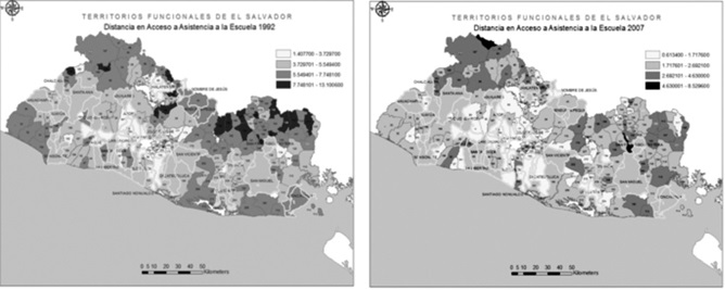 Fuente: Ministerio de Educación de El Salvador.En cuanto al acceso a teléfono, las oportunidades son claramente distintas respecto a 1992. El IOH pasa de cero a veintiséis en 2007, reflejado en un progreso generalizado, que perdió intensidad en la zona costera occidental del país. La particularidad de este servicio es que, al mismo tiempo, ha pasado a ser una parte importante del presupuesto de las familias salvadoreñas, tanto en la modalidad de telefonía fija como móvil. El recuadro 2 contiene un resumen de la evolución de las telecomunicaciones en El Salvador.