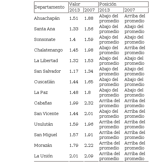 Una variable importante, por su relevancia en la definición de la capacidad de compra de los hogares y, por ende, de un conjunto de circunstancias y acceso a infraestructura básica, es la distribución de ingreso per cápita mensual en el territorio. El cuadro 1 muestra que entre los años 2007 y 2013 dicha distribución no ha variado mayoritariamente, ya que 10 de los 14 departamentos del país mantienen su posición relativa respecto al promedio del país de cada año.