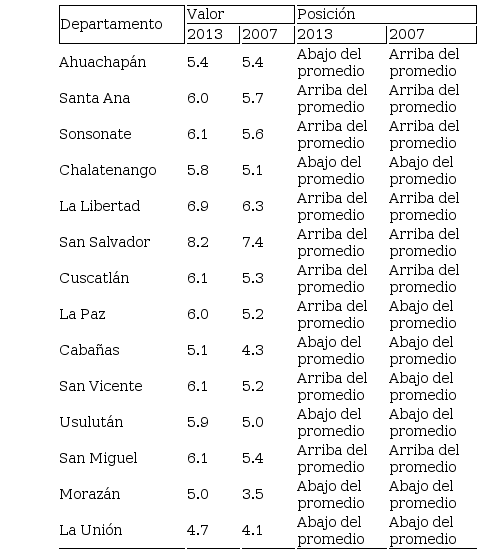 Por último, y no por eso menos importante, la distribución de las variables educativas, aproximadas por la Tasa de escolaridad promedio de la población de 6 años y más, evidencia que son 11 de los 14 departamentos del país los que mantienen su posición relativa respecto al promedio del país. (Véase cuadro 8.)