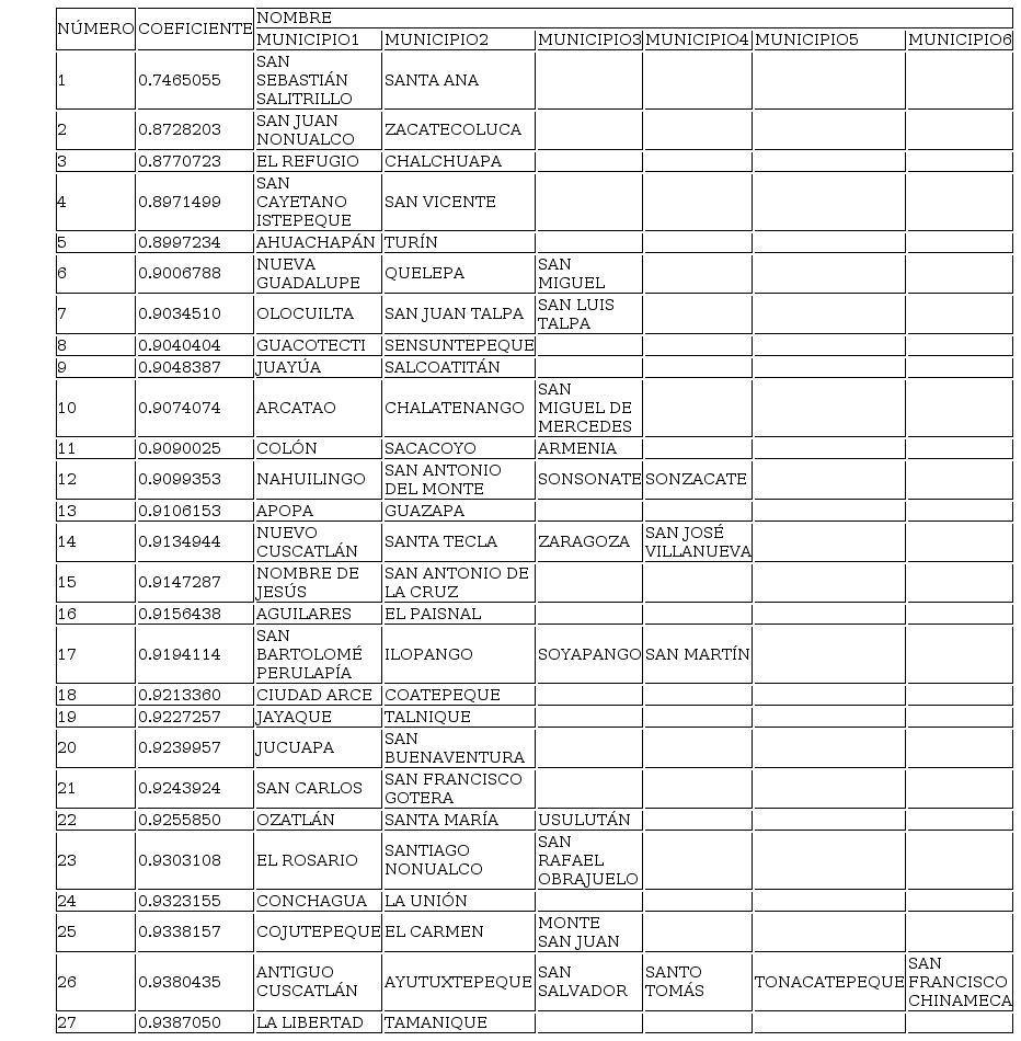 Los municipios del departamento de Morazán, como Cacaopera, Corinto, Guatajiagua, Joateca, San Isidro, San Simón, Torola y Yamabal; algunos del norte de San Miguel, como Carolina, Nuevo Edén de San Juan, San Antonio y San Gerardo; el municipio de Guaymango, en Ahuachapán, y otros representan la expresión inequívoca de la desigualdad territorial, ya que registran altas tasas de pobreza multidimensional que contrastan con los resultados de otros municipios, cuyos IPM son claramente inferiores. Entre estos últimos destacan los pertenecientes a San Salvador, como Apopa, Ayutuxtepeque, Cuscatancingo, Ilopango, Mejicanos, San Marcos, San Martín, San Salvador, Soyapango, Tonacatepeque y Ciudad Delgado; junto con algunos de La Libertad, como Antiguo Cuscatlán, Colón, Nuevo Cuscatlán y Santa Tecla, así como otros municipios de Santa Ana y San Miguel.