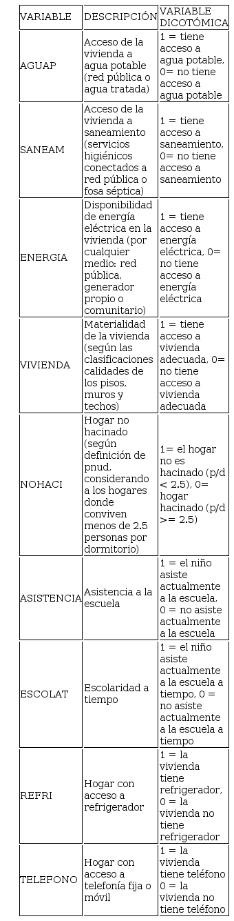 El cuadro 2 resume las ventajas incorporadas en el cálculo; la elección de estas ventajas y sus respectivas justificaciones fueron retomadas en su mayoría de Tomaselli (2014). El agua potable y el saneamiento adecuado son reconocidos por las Naciones Unidas como una necesidad para la realización de los derechos humanos en términos de salud; el acceso a la energía eléctrica es importante para el correcto desempeño de las labores educativas asociadas con incrementos de productividad; tener una vivienda apropiada y el menor hacinamiento en el hogar garantizan una protección del medio natural y las mejoras de salud, tal como lo reconocen la Comisión Económica para América Latina y el Caribe y el Programa de las Naciones Unidas para el Desarrollo .