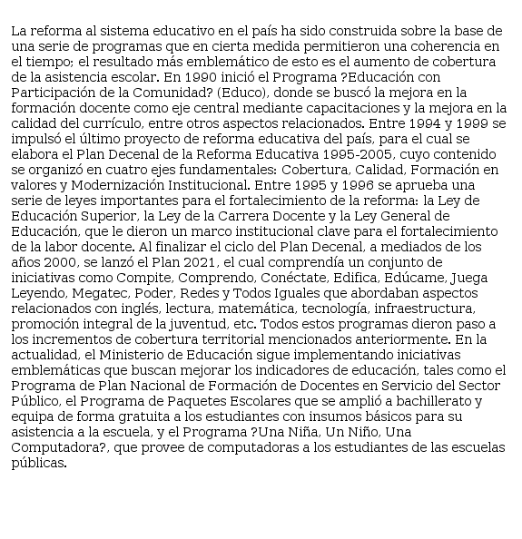 La magnitud de los cambios positivos se explica en buena medida por los esfuerzos públicos de cobertura, tal como se mencionó anteriormente, que pasa de un mínimo de 47 unidades a otro de 72, y cuyos resultados se manifiesta en mayor medida en los territorios cercanos a la zona central, incluyendo la zona central del norte del país. Así mismo, se subraya que el rango en la distribución de la distancia pasó de 11.6 puntos en 1992 a cerca de 8 en el año de 2007 (véase anexo 5). El recuadro 1 contiene un resumen cronológico de los programas ejecutados en el país por parte del Ministerio de Educación.