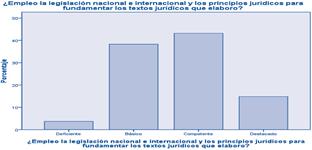 Entre el nivel competente y destacado se logra un porcentaje del 58% de estudiantes que emplean la legislación nacional e internacional para fundamentar los textos jurídicos y hay un 42% que se encuentran en el nivel deficiente y básico. A pesar que supera el 50%, existe un porcentaje elevado en los niveles inferiores. Esto es preocupante, porque a lo largo de toda carrera se supone se estudia la legislación nacional e internacional. Para ser estudiantes egresados, que según el plan de estudios de la Licenciatura en Ciencias Jurídicas (2008) debe haber logrado un nivel destacado en el logro de esta competencia.