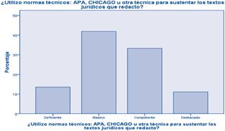 Los resultados demuestran que el nivel en el empleo de normas técnicas APA u otras es bajo. Estos datos reflejan la existencia de muchas falencias y no garantizan el cumplimiento de los niveles aceptables exigidos en el plan de estudios de la carrera. Según Villardón-Gallegos (2006) la competencia se demuestra haciendo y estos resultados suponen que los estudiantes no emplean de manera suficiente las normas técnicas para elaborar los textos científicos jurídicos. En la gráfica uno, los estudiantes expresan poseer un conocimiento competente de la técnicas que se emplean para elaborar textos jurídicos, pero no las aplican suficientemente en la elaboración de textos, según los resultados de la aplicación de normas Técnicas APA.