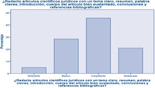 El 66.7 % de estudiantes afirman encontrarse en el nivel competente y destacado. Mientras que el 33.3% se encuentra en el nivel deficiente y básico en la elaboración de artículos jurídicos científicos con todas sus partes. El resultado obtenido sobre la elaboración de artículos científicos predomina el nivel competente. Es un nivel aceptable en términos porcentuales. Sin embargo, estos resultados resultan limitados porque se debería de lograr al menos los primeros porcentajes del nivel destacado, para que la competencia sea adquirida de manera satisfactoria, pero se encuentra en el nivel medio del competente.