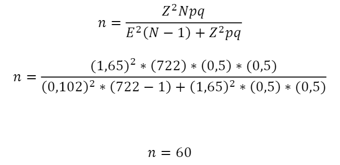 The parameters for the calculation of the sample are N = 722, E = 10.2%, Z = 1.65, p = 0.5 y q = 0.5. The calculation of sample size for medium-sized Enterprises in the commercial sector of Quito city is detailed below.