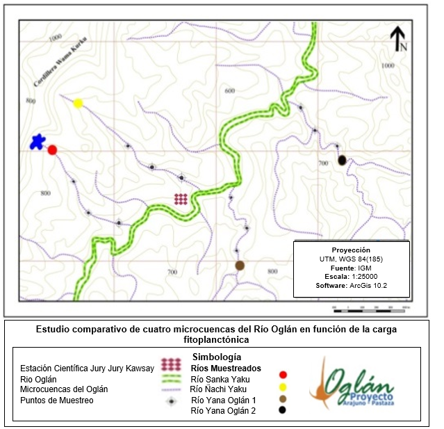 This work was carried out in four micro-watersheds of the Oglán River, located in the Protector forest "Oglán Alto" of the province of Pastaza-Ecuador, which goes from 580 to 1100 A.S.L. during the dry season in September of 2015. A qualitative method of collection was applied, 18 samples were taken by basin with a net type "cone" of 50 µm, which were gauged in 200 ml of water and preserved with formaldehyde to 4% plus 4 g of sugar to better preserve the tissues. In addition, abiotic parameters of the rivers (nitrates, DBO, turbidity etc.) were taken to correlate-those with the structure and phytoplankton composition of the place.