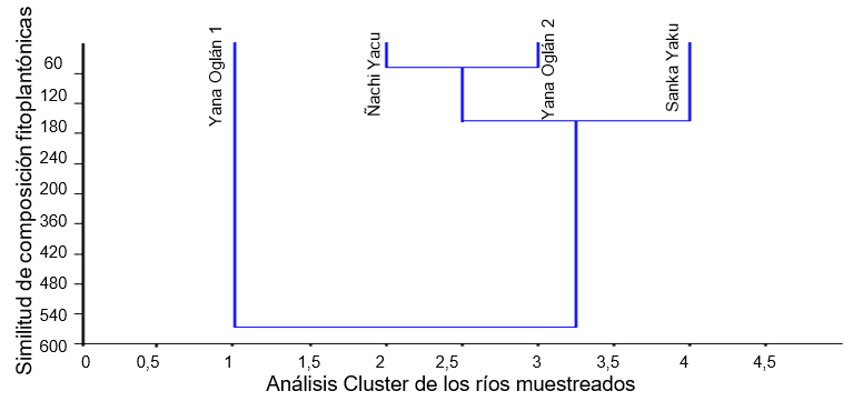 El análisis de clúster mostró que los ríos Yana Oglán 2 (río 4) y el río Ñachi Yaku (río 2) están más relacionados en composición y estructura fitoplanctónica, mientras que los ríos Sanka Yaku (río 1) y Yana Oglán1 (río 3) son los ecosistemas acuáticos más distintos. Dicho análisis se convierte así en una herramienta para la conservación y manejo a futuro de estos cuerpos de agua (ver Figura 3).