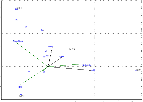 El CCA, muestra las relaciones entre los factores bióticos y abióticos de los ríos muestreados e identifica las principales variables que influyen en la dinámica poblacional encontrada en este estudio.