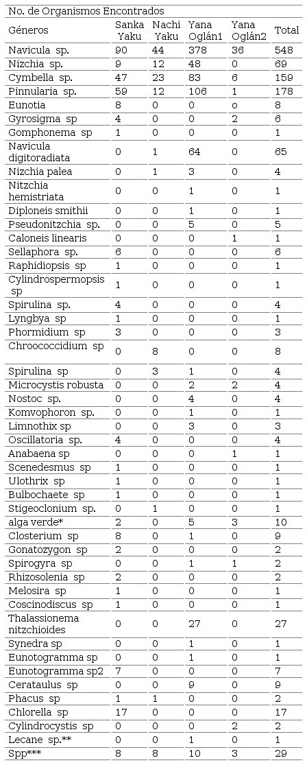Las clases Bacillariophyceae (diatomeas), y Cyanophyceae (cianobacterias) fueron las dominantes en los cuatro ríos analizados y el género Navícula fue el más abundante en todos los cuerpos de agua analizados (ver figura 2 y tabla 1). Este comportamiento poblacional se registra en otros estudios realizados en ecosistemas oligotróficos amazónicos y está dentro de los resultados esperados para este tipo de ríos [ 18, 32, 33, 34].