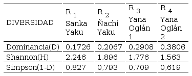 Para cada grupo de organismos se determinaron la abundancia por clase, riqueza por estaciones o lugares de muestreo y abundancia relativa del total de especímenes. Para cuantificar la diversidad y dominancia de los ríos analizados se utilizaron los índices de Shannon-Wiener y Simpson. También se determinó el estado trófico mediante el índice de Barbe., el cual asigna coeficientes a cada grupo de algas, comparándolo con su abundancia relativa; este índice clasifica los ecosistemas acuáticos en tres estados tróficos que son: de 0-20 oligotrófico, de 21-50 mesotrófico y de 51-100 eutrófico. [ 27, 28].