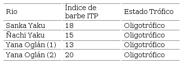 El análisis del ITP o índice de Barbe determino el estado trófico de los ríos, en donde los cuatro ríos muestreados poseen estados oligotróficos (Tabla 3)