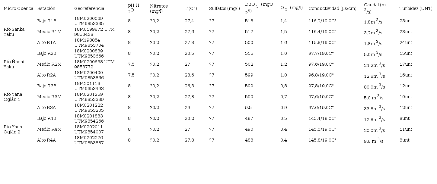 Para la toma de muestras se seleccionaron cuatro microcuencas: Sanka Yaku, Ñachi Yaku, Yana Oglán 1 y Yana Oglán 2. La selección de dichos afluentes se realizó tomando en cuenta la facilidad de acceso en relación con la estación científica, en cada microcuenca se situaron tres estaciones de muestreo a intervalos de 200 m, considerando una zona alta, media y baja [ 15]. En cada estación se registraron datos de las condiciones ambientales y se midieron parámetros físicos-químicos (temperatura, pH) mediante un kit de análisis de agua marca HORIBA. El oxígeno disuelto se determinó mediante un medidor MILWOKKE INSTRUMENTS AUSTRALIA y la turbidez del agua fue analizada en el laboratorio de la Facultad de Ciencias Químicas de la UCE.