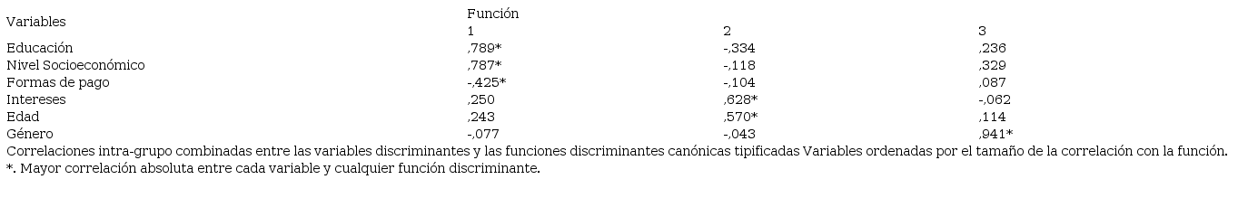 En la prueba de correlaciones canónicas se observa que hay significancia en dos dimensiones para trabajar. En la tabla 2 se muestra que Educación, Nivel Socioeconómico son influyentes de primera dimensión, y, edad e interés en segunda dimensión. El género aparece en tercera dimensión y se puede considerar excluido para los siguientes análisis.