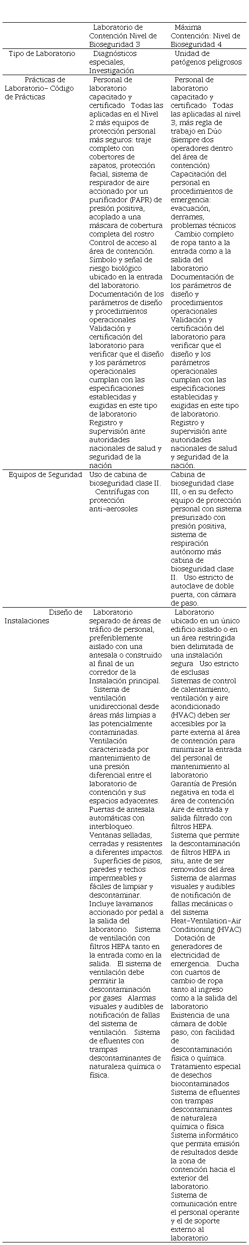 En la Tabla 1, se muestran los requisitos técnicos de los laboratorios de contención BSL-3 y BSL-4.