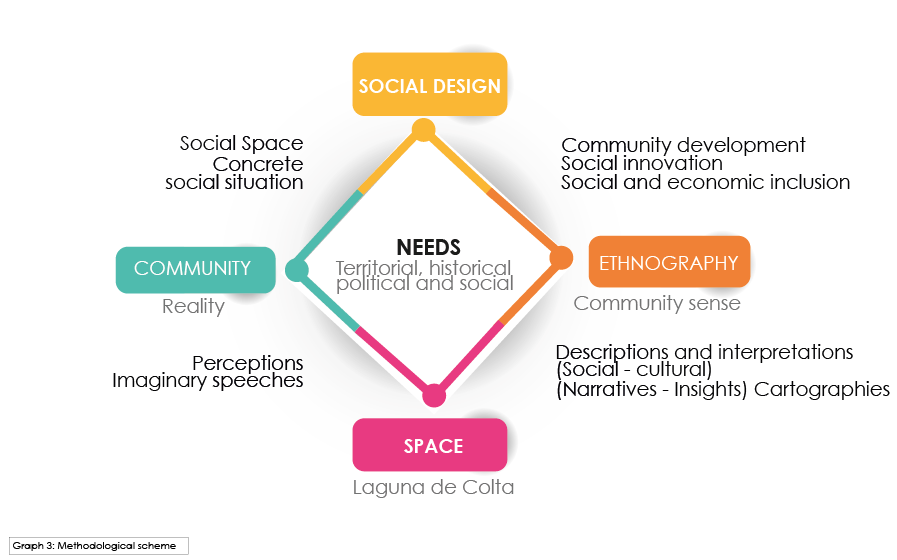 The approach of the methodological guide is a response to the need for interdisciplinary research, which addresses the various visions of anthropology, sociology, architecture and design. This based on a comprehensive analysis that leads to the understanding of the dynamics that are built between the place and the community that inhabits it. Social representations and imaginaries, as well as their expressions, are studied in terms of spatiality, as well as temporality. In this sense, the proposed methodology is not only an academic tool, but also a way to highlight a social problem, between the community and its daily needs and the administration of the territory by the institutions in charge. In this way, links are built between the theoretical and the practical of design, since this tool allows access to the understanding of reality and, therefore, build a diagnosis and strategies for the project phase.